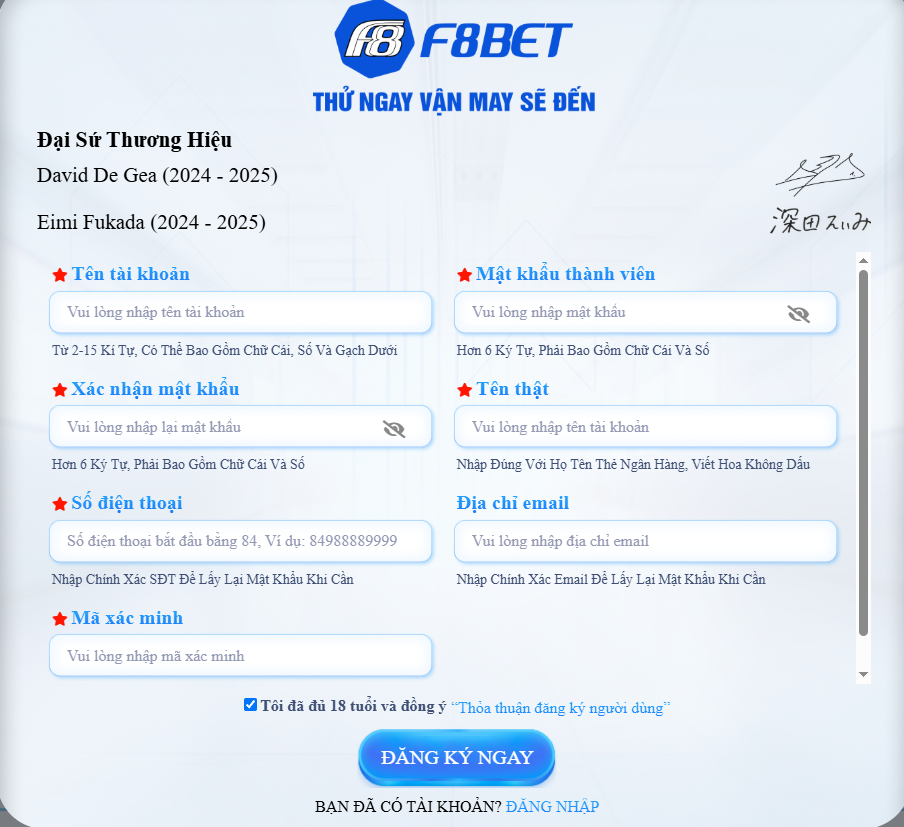 Việc tạo tài khoản tại F88BET vô cùng dễ dàng – chỉ mất vài phút là bạn đã có thể trở thành thành viên và bắt đầu hành trình cá cược cùng hàng loạt trò chơi hấp dẫn. Các bước đăng ký như sau: