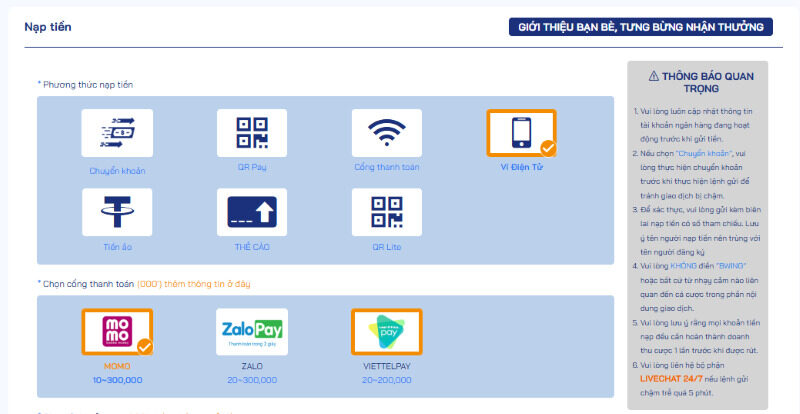 • Hỗ trợ nhanh chóng: Nếu lệnh gửi tiền của bạn bị chậm trễ quá 5 phút, đừng ngần ngại liên hệ ngay với bộ phận LIVECHAT 24/7 để được hỗ trợ kịp thời.