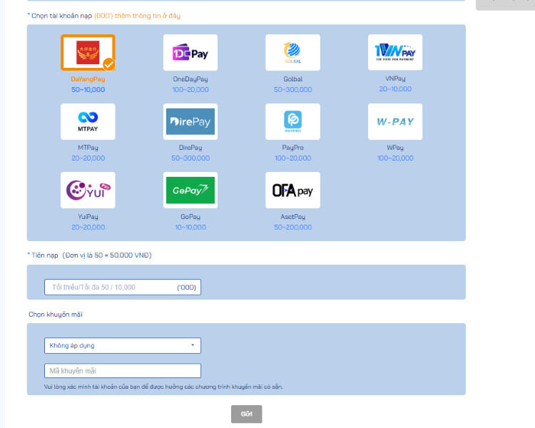• Ví dụ với “Cổng thanh toán”: Các lựa chọn như DaYangPay (50-10,000 ‘000 VNĐ), OneDayPay (100-20,000 ‘000 VNĐ), Golbal (50-300,000 ‘000 VNĐ), VNPAY (20-10,000 ‘000 VNĐ) và nhiều cổng khác nhà cái Bong88 cung cấp.